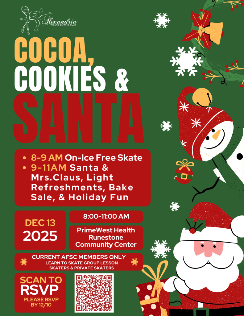 Weβre excited to invite all current Alexandria Figure Skating Club members to our Cocoa, Cookies & Santa event on Saturday, December 13.