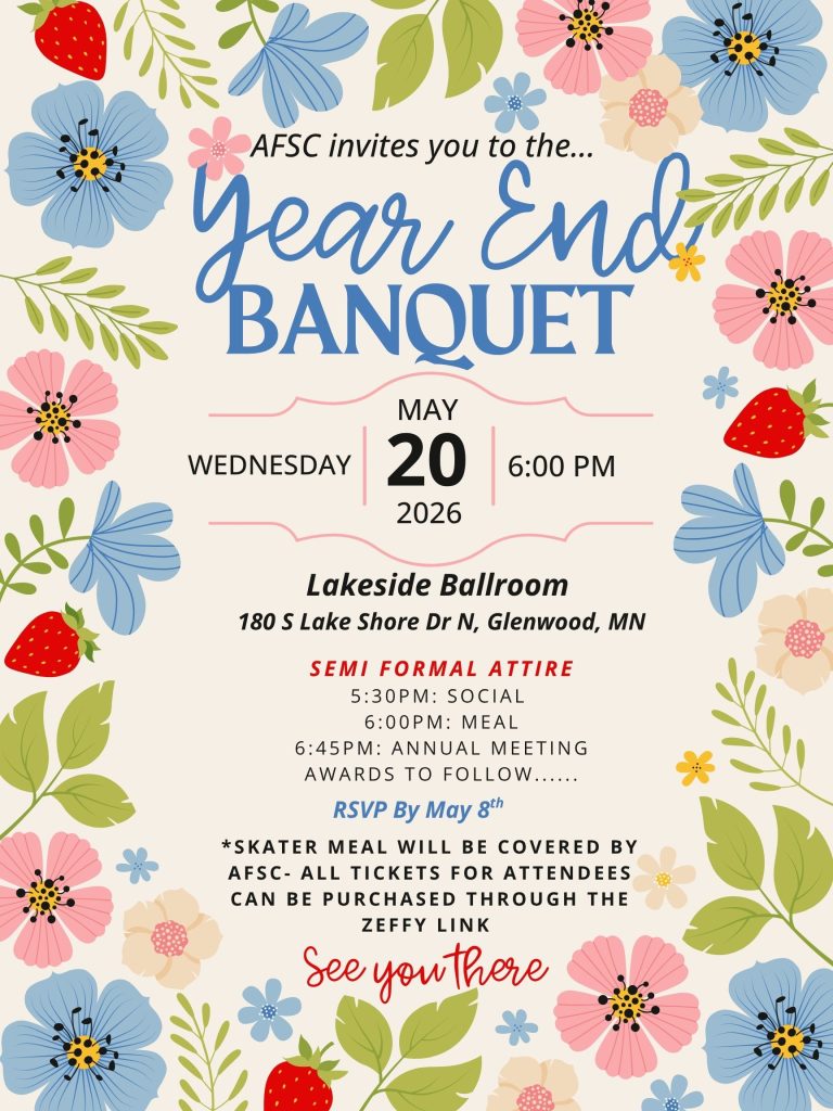 You are invited to the 2026 Spring Banquet/ Annual Meeting! All members of the Alexandria Figure Skating Club are invited to attend as we celebrate the accomplishments of our skaters from the 2025-2026 season. The evening will also include updates on summer activities, a preview of exciting events for the upcoming season, and the appointment of the 2026-2027 AFSC Board.